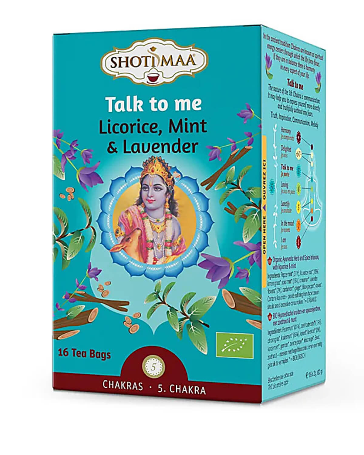100% Βιολογικό Ρόφημα με Γλυκόριζα, Μέντα & Λεβάντα – 16 Φακελάκια Το Talk to Me Tea υποστηρίζει και εναρμονίζει το 5ο Τσάκρα (Λαιμός) – το κέντρο της επικοινωνίας, της αλήθειας και της δημιουργικής έκφρασης. Βοηθά να ανοίξει η ροή της ενέργειας που μας επιτρέπει να μοιραζόμαστε τη φωνή μας, να συντονίζουμε τις σχέσεις μας και να εκφράζουμε τον αυθεντικό μας εαυτό. Seven Chakras Teas – Εμπνευσμένα από την Αγιουρβεδική παράδοση 1. Root – I Am 2. Sacral – In the Mood 3. Solar Plexus – Sanctify 4. Heart – Loving 5. Throat – Talk to Me 6. Third Eye & Crown – Delighted 7. All Chakras – Harmony Συστατικά Μέντα* (31%), γλυκόριζα* (15%), λεμονόχορτο*, δυόσμος* (15%), κανέλα*, άνθη λεβάντας* (2%), κάρδαμο*, τζίντζερ*, μαύρο πιπέρι*, γαρύφαλλο*. (* = βιολογικά) Τι είναι τα Τσάκρα; Τα Τσάκρα είναι λεπτοφυή ενεργειακά κέντρα – «τροχοί ενέργειας» – που ρυθμίζουν τη ροή της ζωτικής δύναμης στο σώμα. Το 5ο Τσάκρα, του Λαιμού, συνδέεται με την επικοινωνία, τη δημιουργικότητα και την αλήθεια. Όταν βρίσκεται σε ισορροπία, μας βοηθά να εκφραζόμαστε καθαρά, να μοιραζόμαστε τις δημιουργίες μας και να συνδεόμαστε αυθεντικά με τους άλλους. Ιδανικό για στιγμές περισυλλογής, δημιουργικής έκφρασης ή όποτε θέλετε να χαλαρώσετε με ένα φλιτζάνι τσάι που ενισχύει τη διαύγεια στην επικοινωνία.