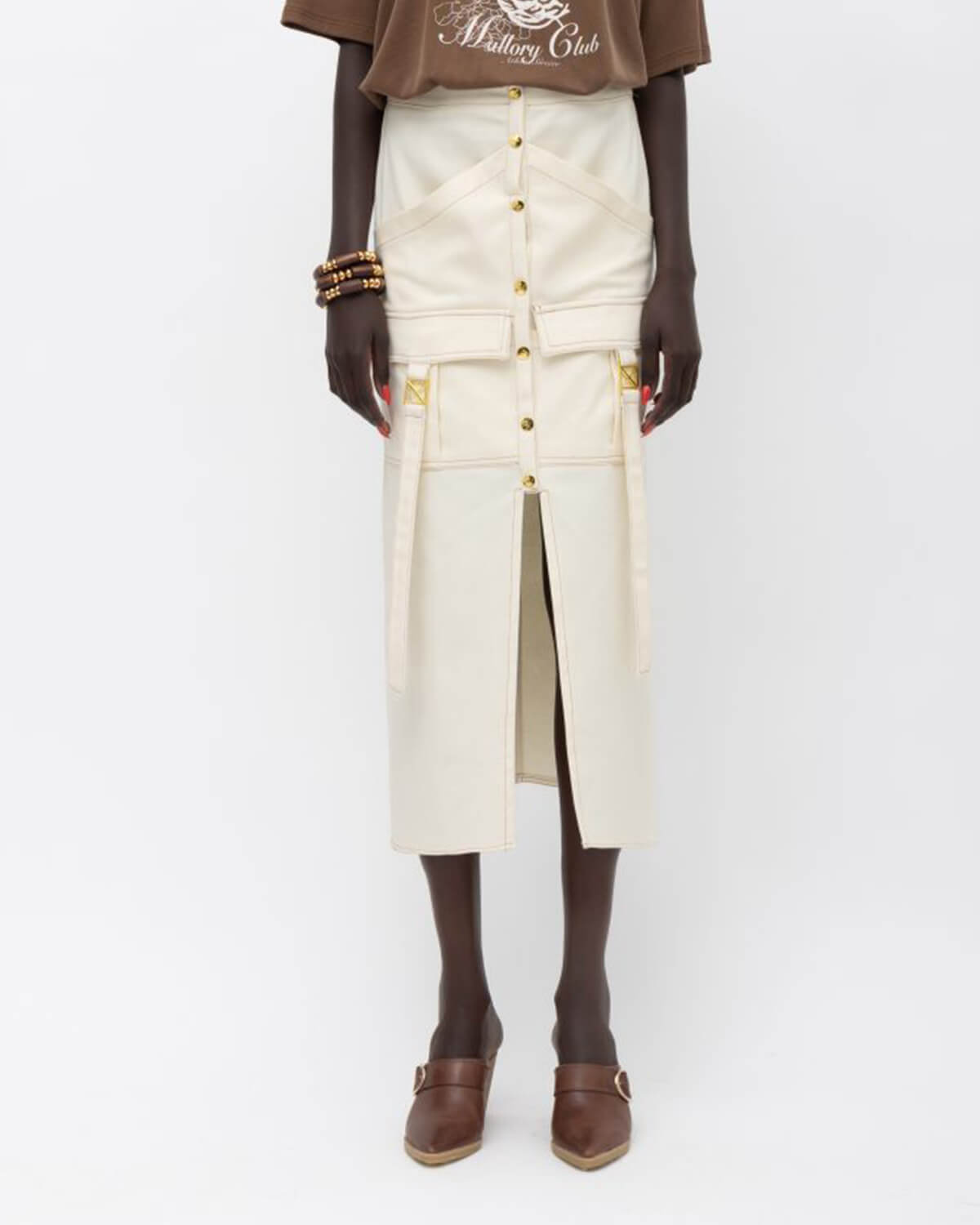 Απογείωσε το στυλ σου με αυτή την iconic midi φούστα από την Mallory the Label, για εμφανίσεις με attitude και άνεση. Η ιδιαίτερη σύνθεση και οι μεταλλικές λεπτομέρειες θα σε κάνουν να ξεχωρίσεις effortlessly, με πέδιλα και λαμπερά αξεσουάρ.