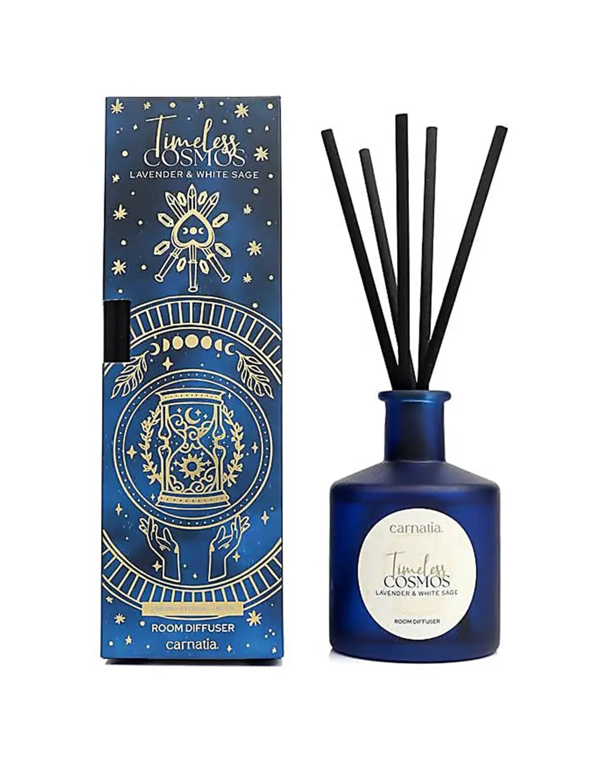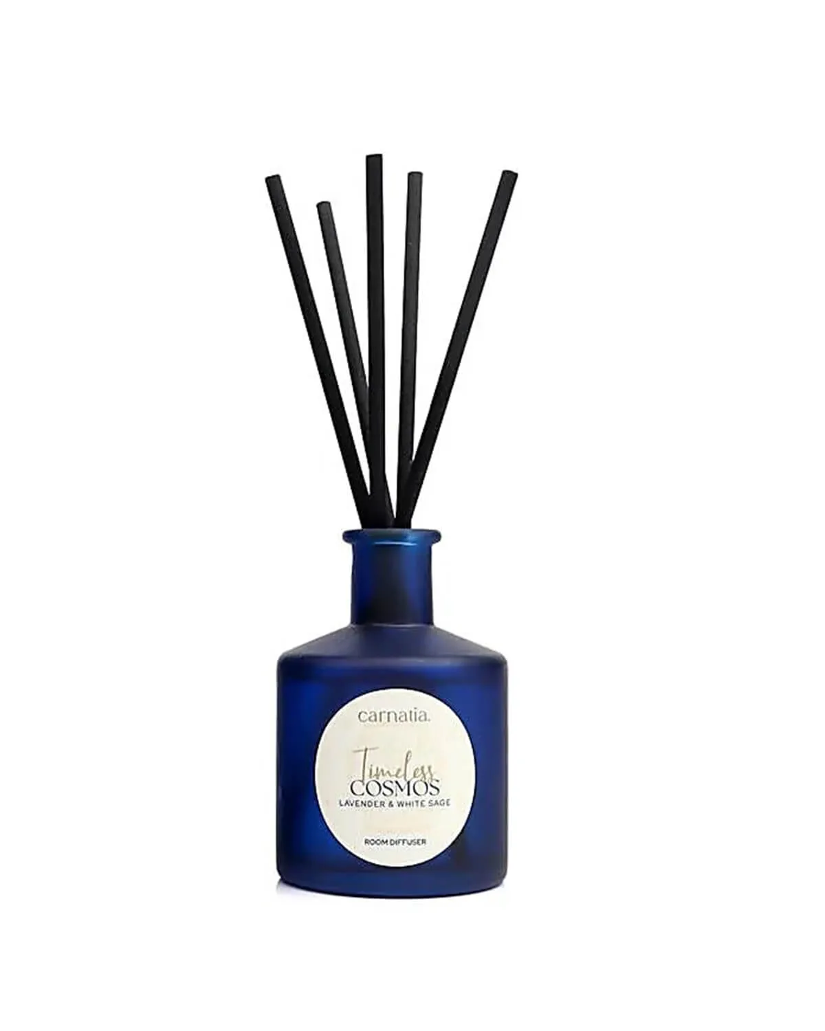 Carnatia Timeless Cosmos diffuser with Lavender & White Sage. Elegant design and a relaxing scent that refreshes any space. The Timeless Cosmos diffuser by Carnatia combines refined aesthetics with a soothing Lavender & White Sage fragrance. The deep–blue glass bottle and black reeds ensure steady diffusion while elevating the ambiance of the room. Ideal for bedrooms, living rooms, or office spaces, it creates a serene and clean atmosphere that enhances everyday relaxation.