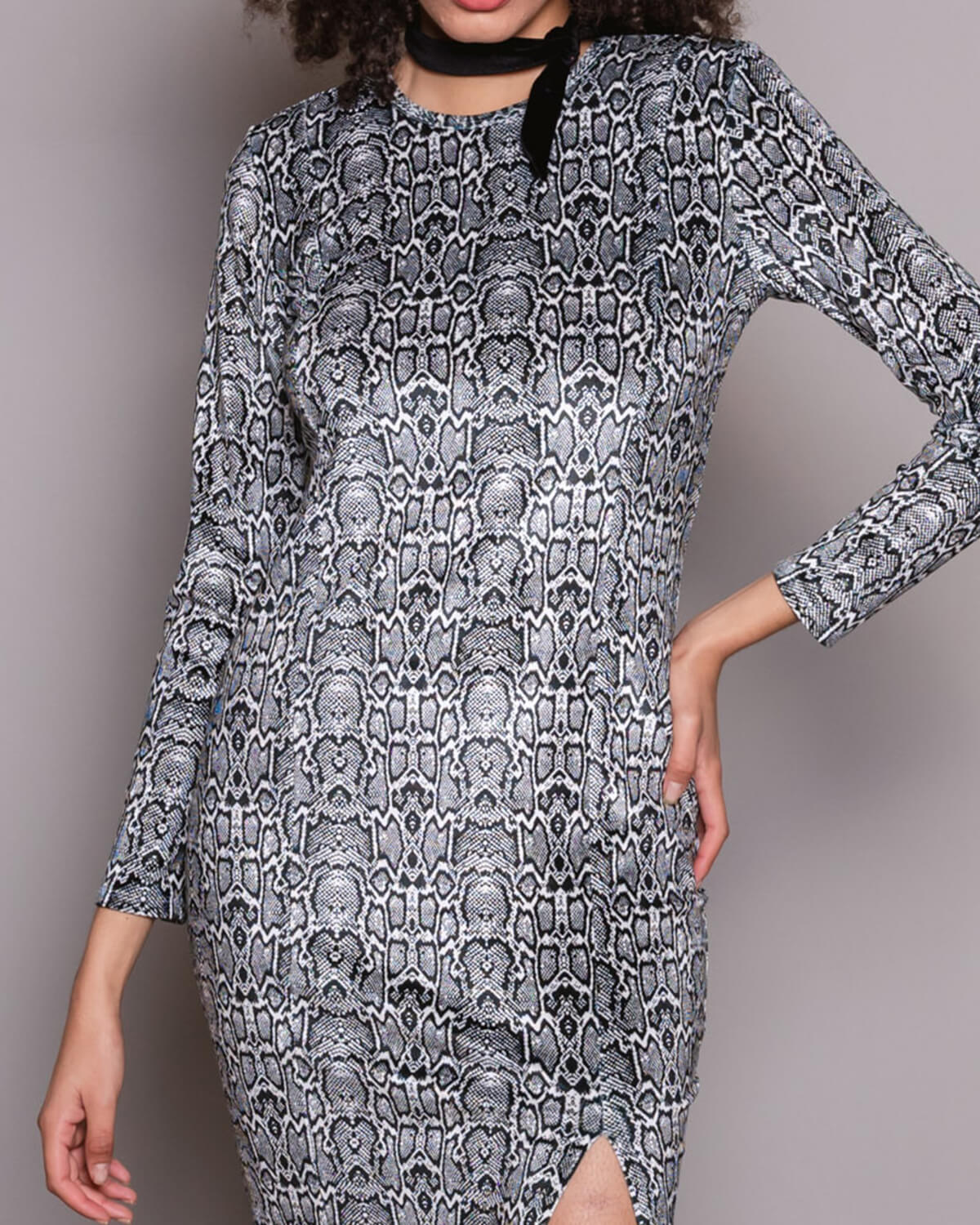 Elevate your everyday appearances with this iconic midi dress by Collectiva Noir. The bold print and the unique texture will make you stand out effortlessly, while you can wear it with boots or sneakers.