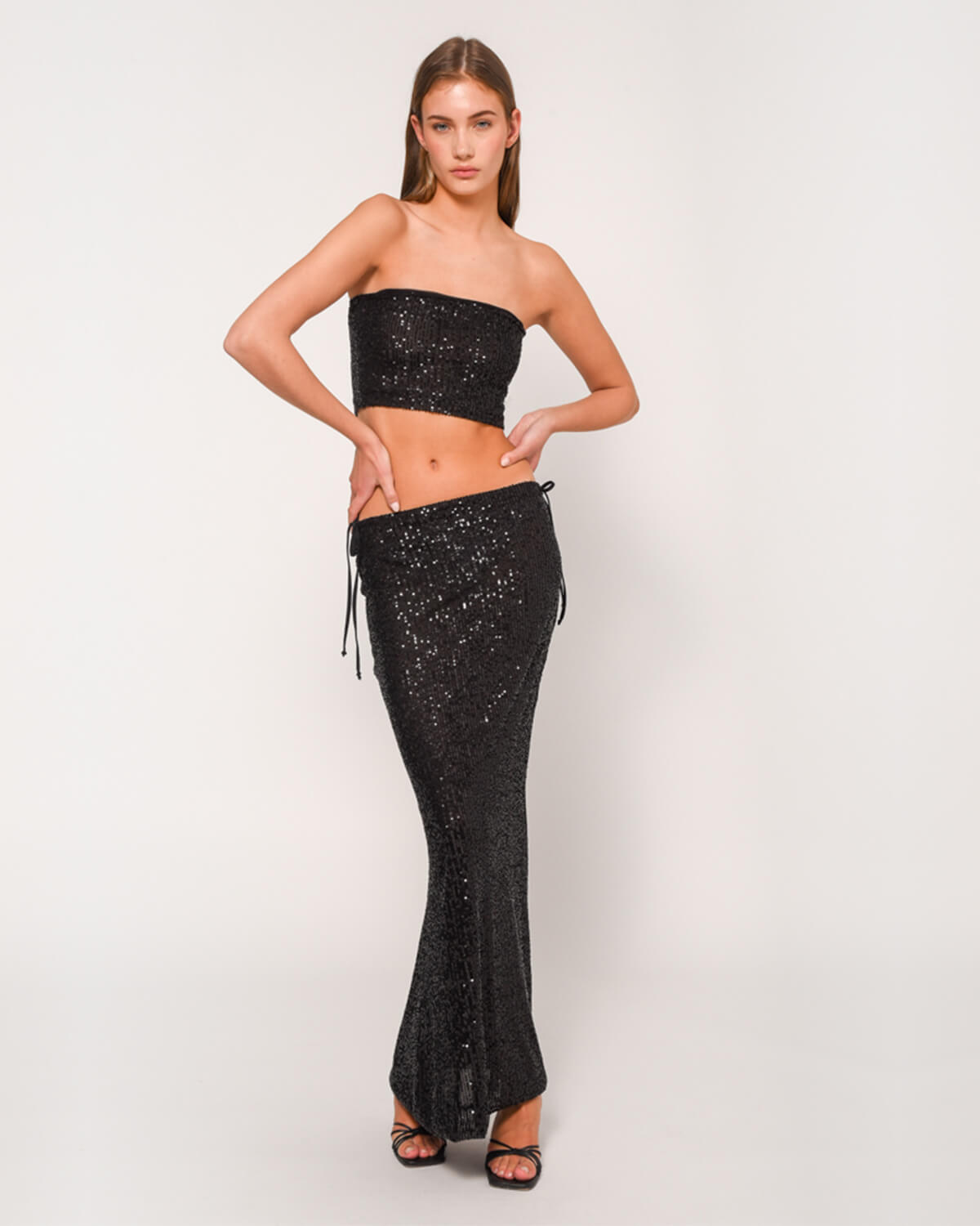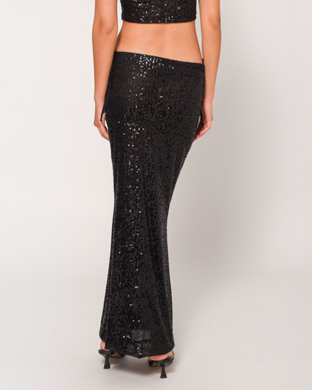Elevate your style with this iconic maxi skirt by Sunsetgo for unique appearances in attitude and comfort. The side tie knots and the sequins will make you stand out effortlessly, with sparkling accessories and heels.