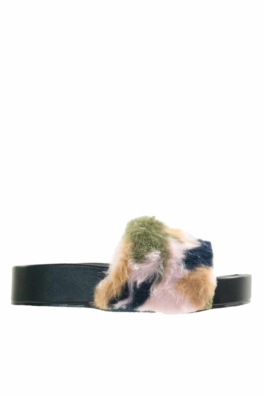 Favela - 240 Camouflage Fur Platform Slide Sandals. The most trendy shoes of the season feature fur detail and an army touch. We are talking of course about the sliders, and this pair is definitely one of the hottest for this season. Material: PU / faux fur. Platform height: 4cm